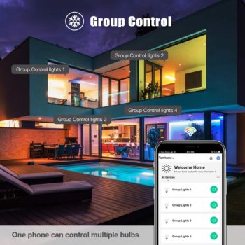Vous pouvez contrôler à distance l’ampoule intelligente sur votre smartphone pour simuler votre présence à la maison. La fonction de contrôle de groupe vous permet de contrôler plusieurs ampoules intelligentes en même temps pour le réglage de la scène. Aussi vous pouvez partager le contrôle de l’ampoule avec d’autres membres de la famille.