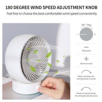 C’est un ventilateur de bureau de petite taille mais puissant. Il est silencieux. Il ajuste la vitesse du vent grâce à un bouton radio réglable à 180 degrés. La position du ventilateur est ajustable grâce au valve réglable.